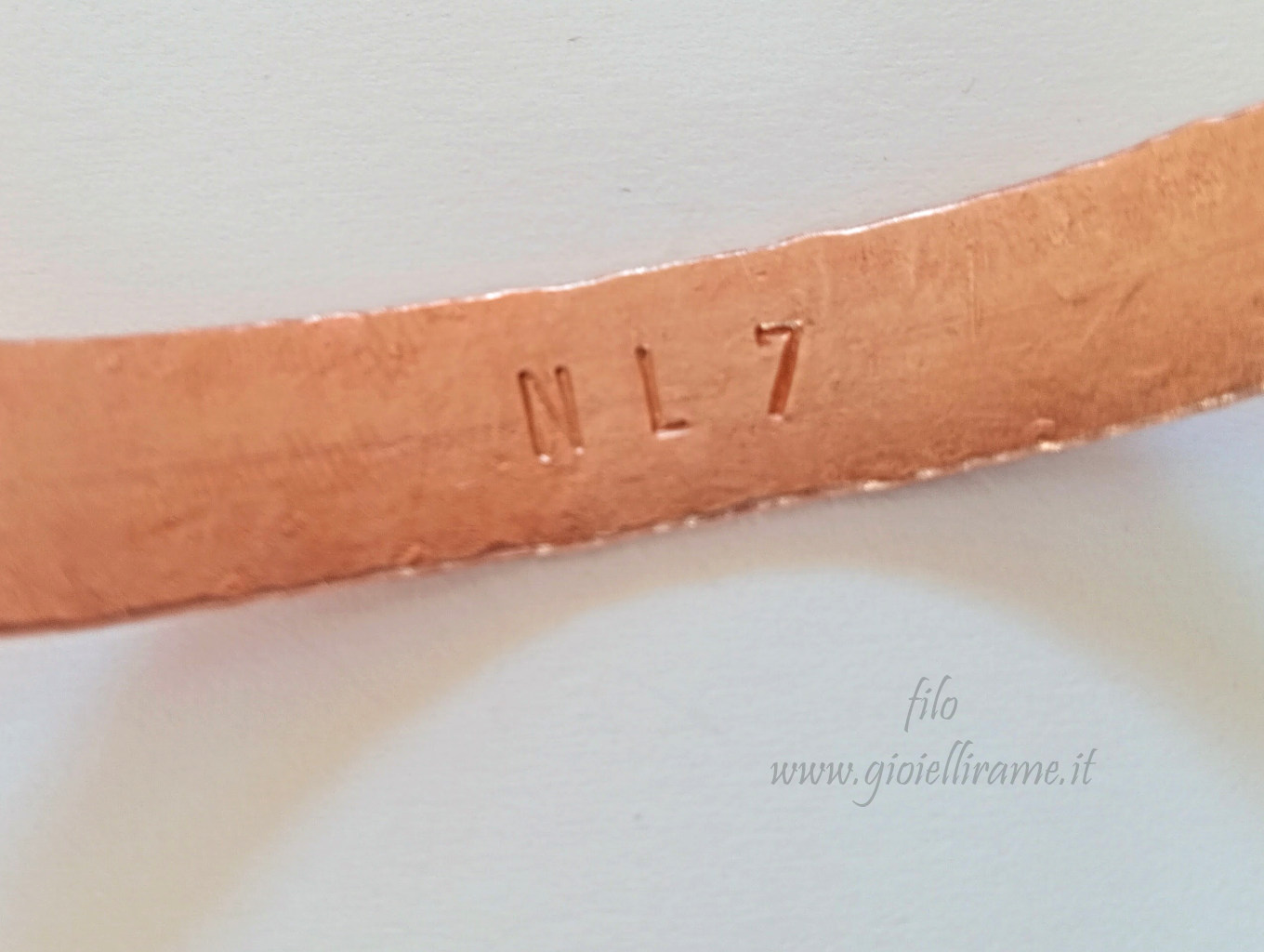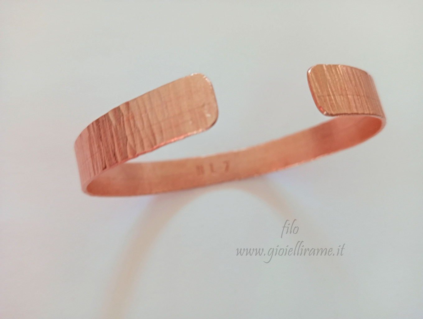 Bracciale in rame artigianale con incisione personalizzata: all'interno del bracciale è stato inciso NL7.